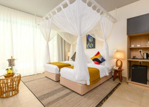 This brand-new luxury hotel is adjacent to a beautiful beach with white sand and Indian Ocean waters, with spectacular turquoise greenery.